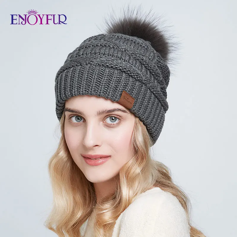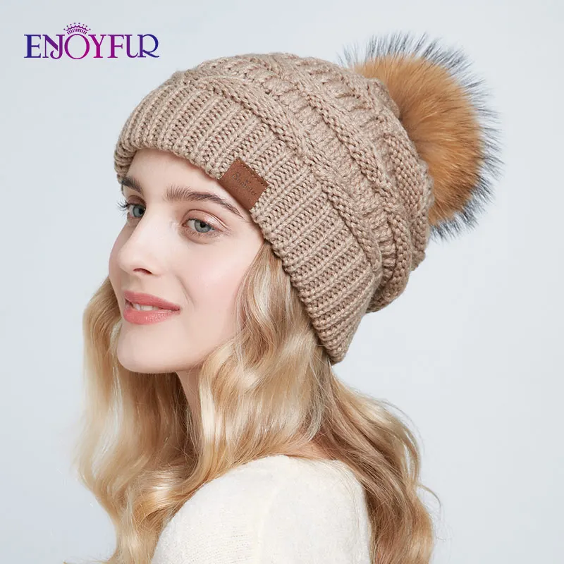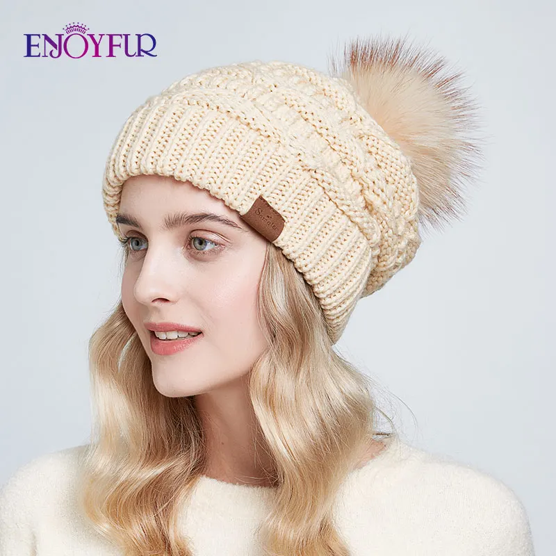Special Offer ENJOYFUR prawdziwe pompon z futra szopa czapki dla kobiet zima ciepłe dzianiny slouchy czapki kobiece luźne czapki narciarskie Discount 40% Today!