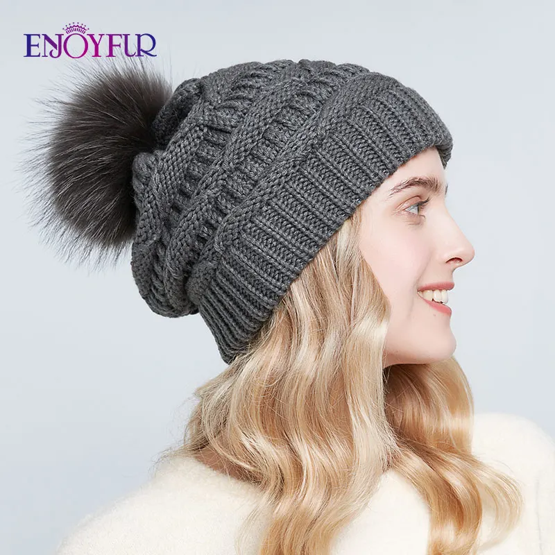 Product Name: ENJOYFUR prawdziwe pompon z futra szopa czapki dla kobiet zima ciepłe dzianiny slouchy czapki kobiece luźne czapki narciarskie