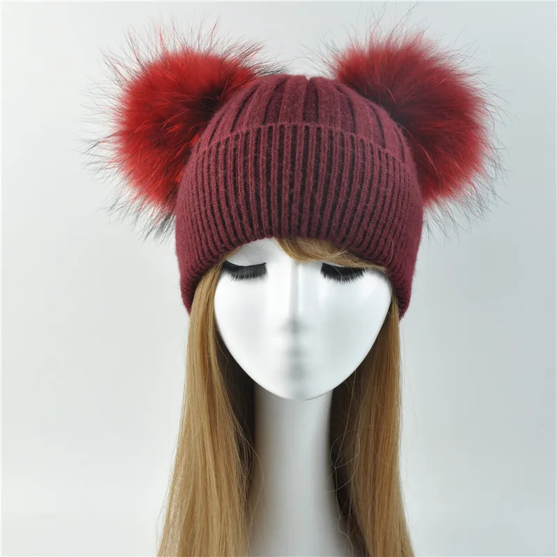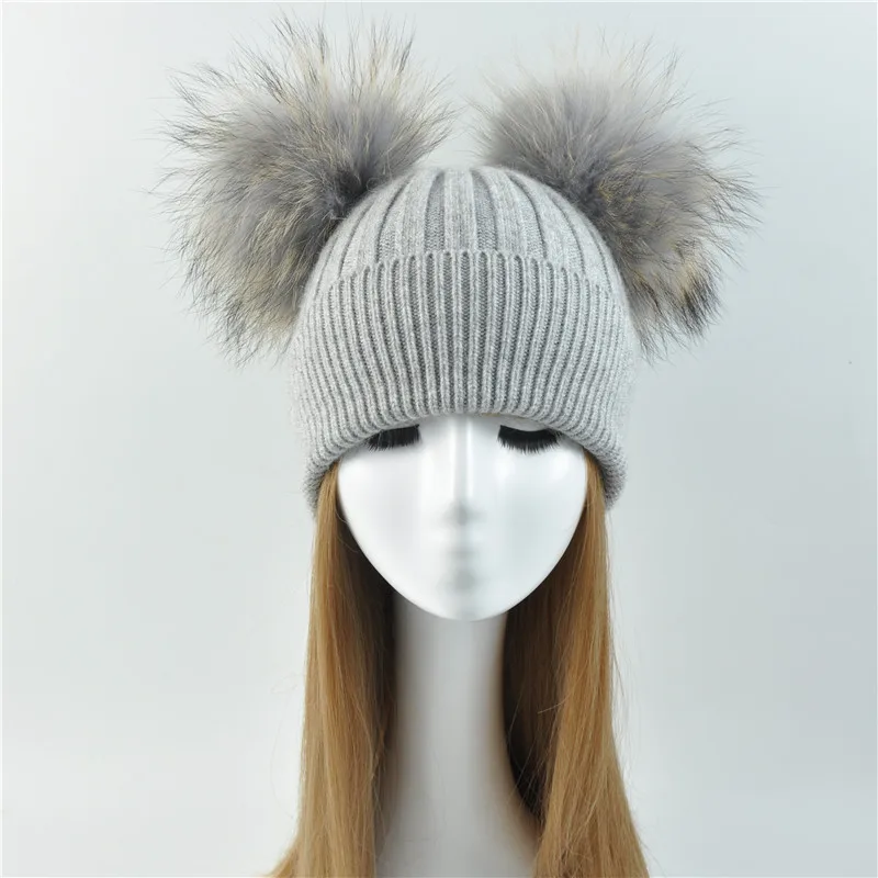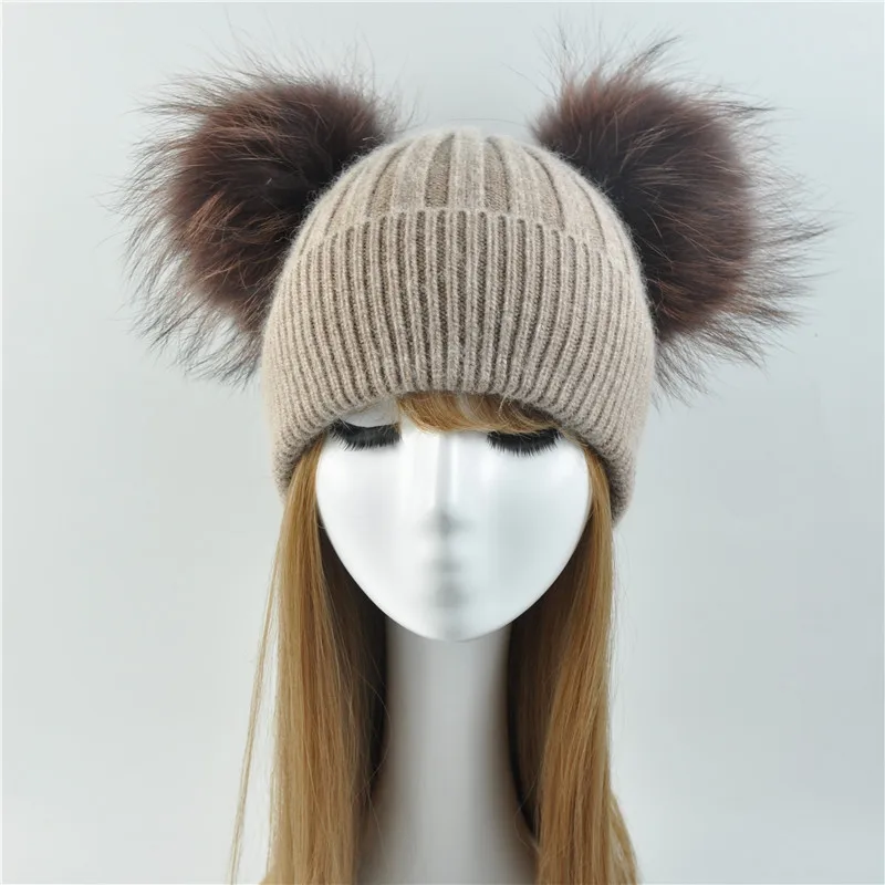 Product Name: Zima prawdziwe futro czapka typu Beanie dla kobiet panie podwójne naturalne szopa futrzany pompon Pom czapka Skullies czapka z dzianiny kapelusz z 2 pompon futrzany