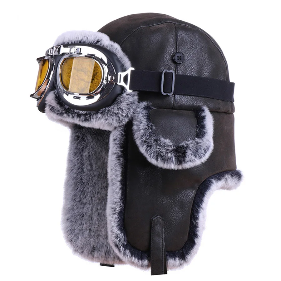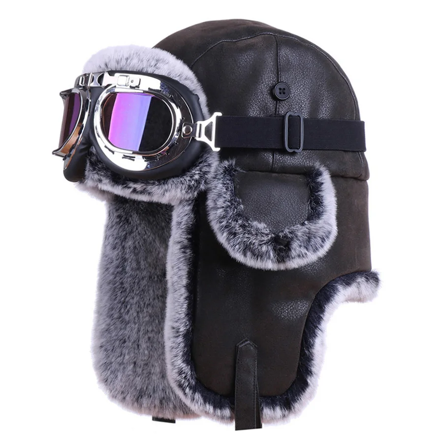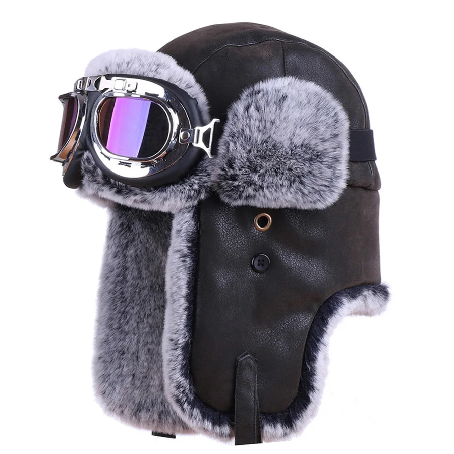 Product Name: Bomber czapki z goglami zimowa męska rosyjska uszanka kapelusz PU skóra Faux futro śnieg czapka narciarska Earflap Pilot Aviator traper