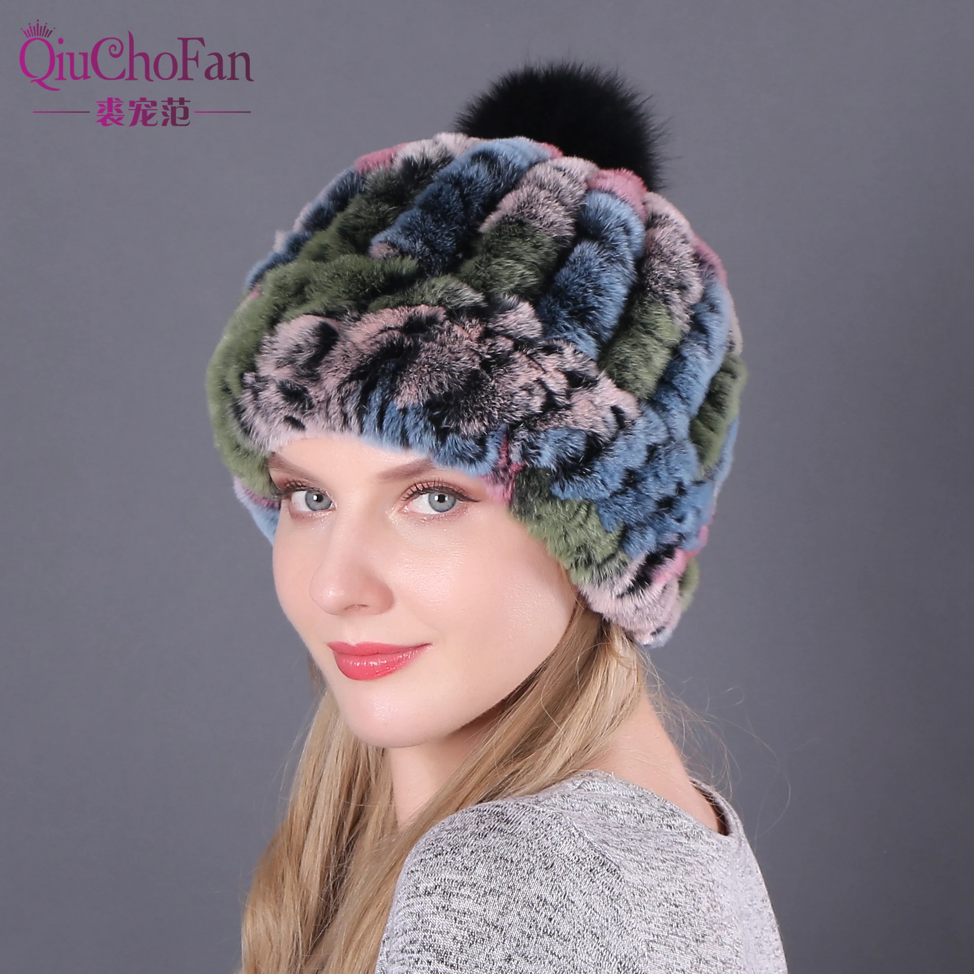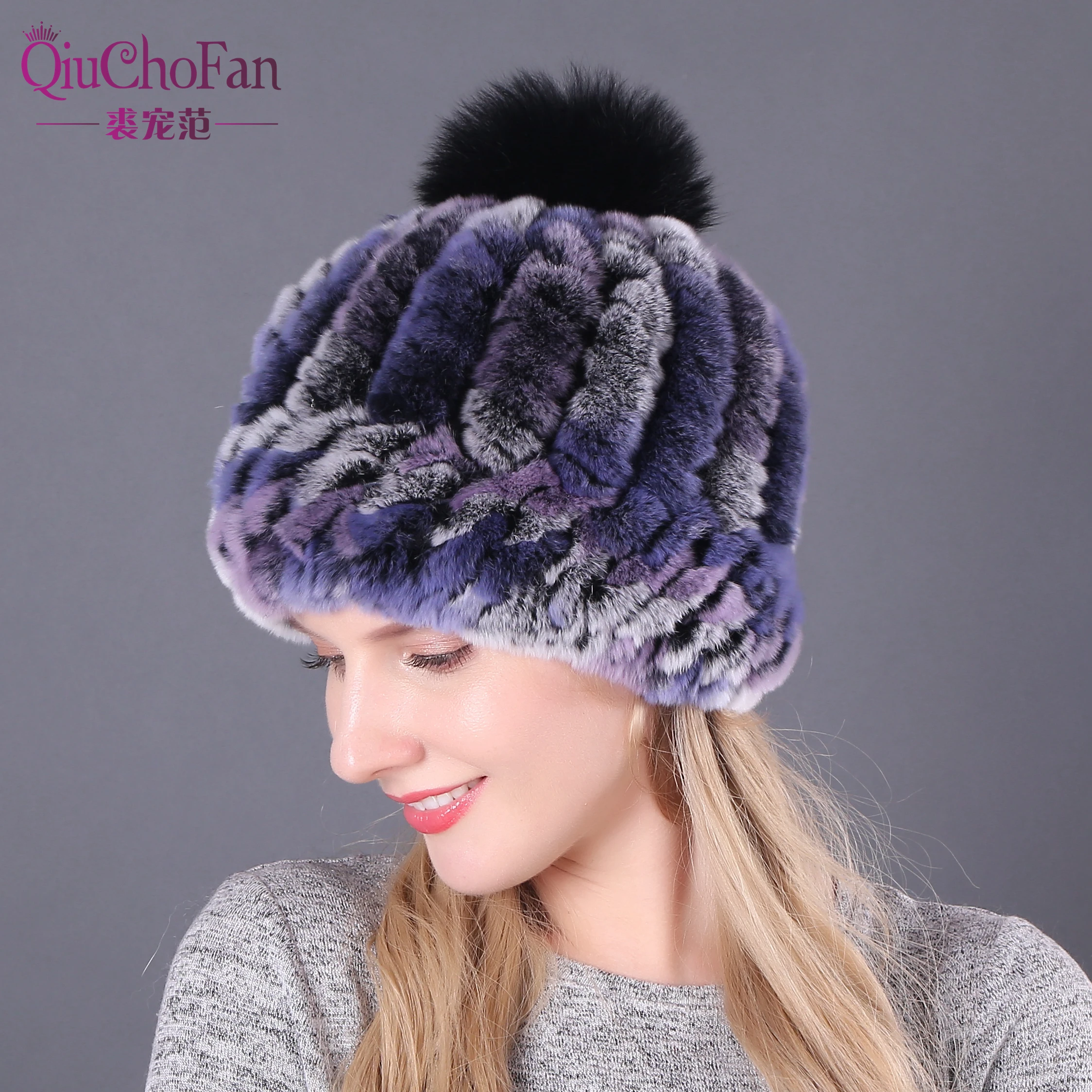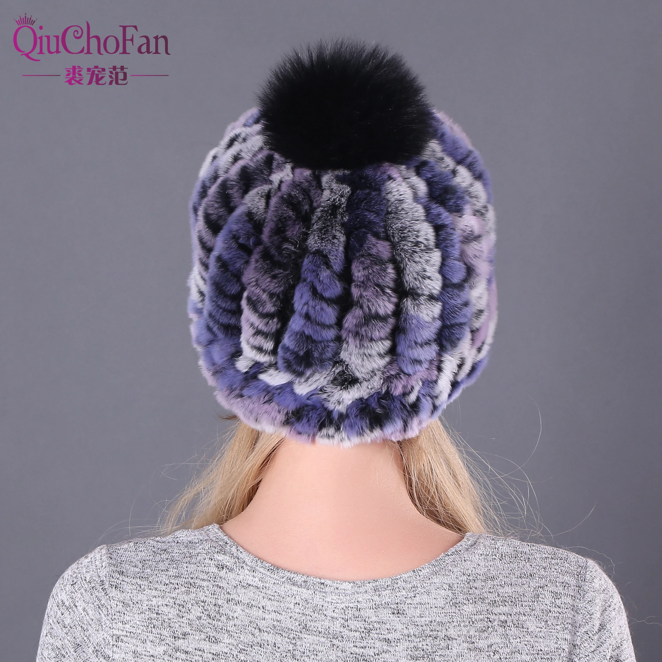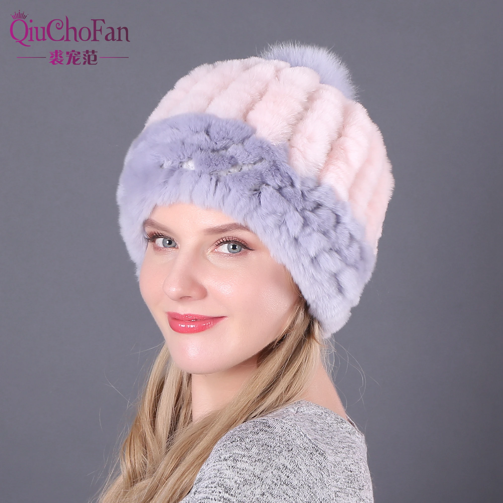 Special Offer Nowy kobiety w paski z dzianiny naturalne Rex królik futro Skullies czapka zimowa pani Rex królik futro czapki dziewczyny prawdziwe Big Fox futrzane czapki Discount 52% Today!