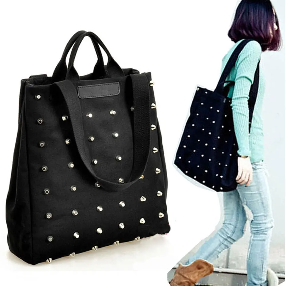Special Offer Gorąca sprzedaż projektant dobre damska Punk Style nity płótnie torebki dużego ciężaru torba na ramię czarny znanych marek wysokiej jakości 30 Discount 30% Today!