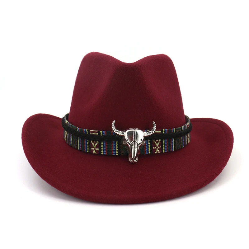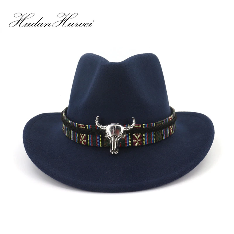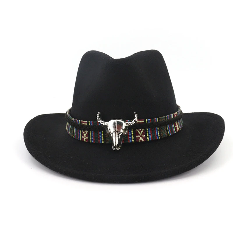 Special Offer Szerokie rondo Western Cowboy jazzowy kapelusz czapka mężczyźni kobiety wełna filcowa fedora kapelusze wstążka metalowa Bullhead ozdobiona czarna czapka Panama Discount 30% Today!