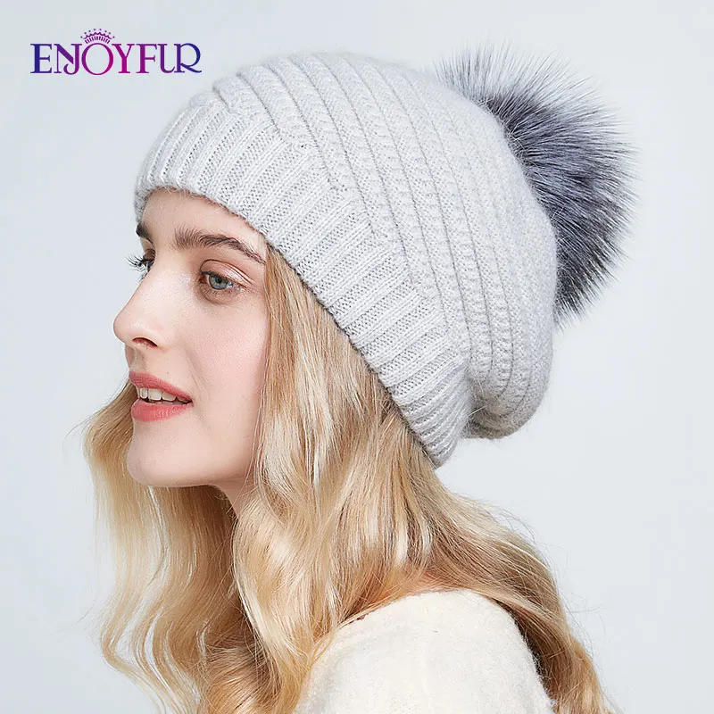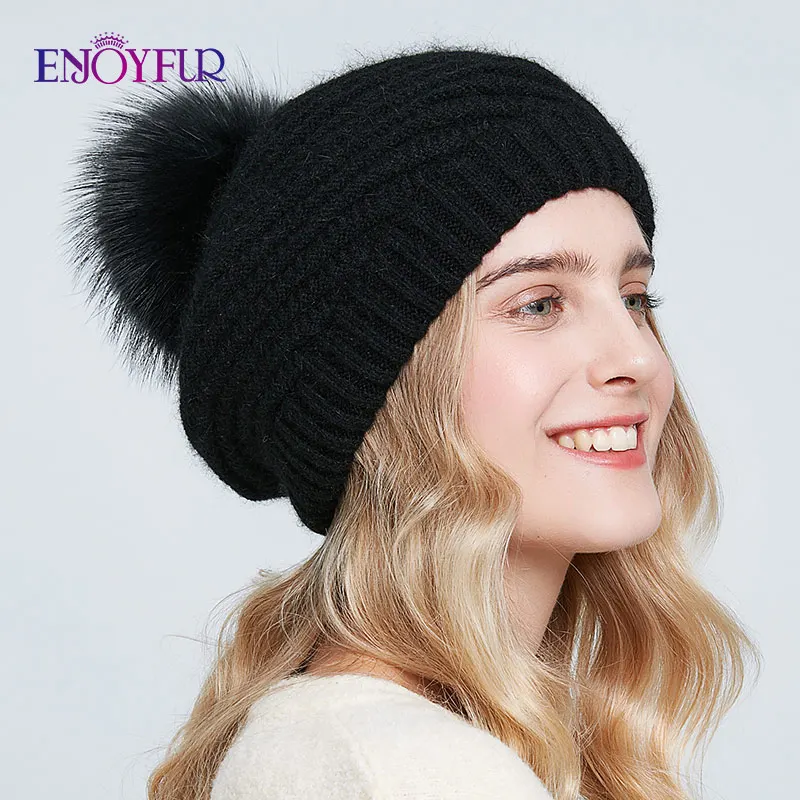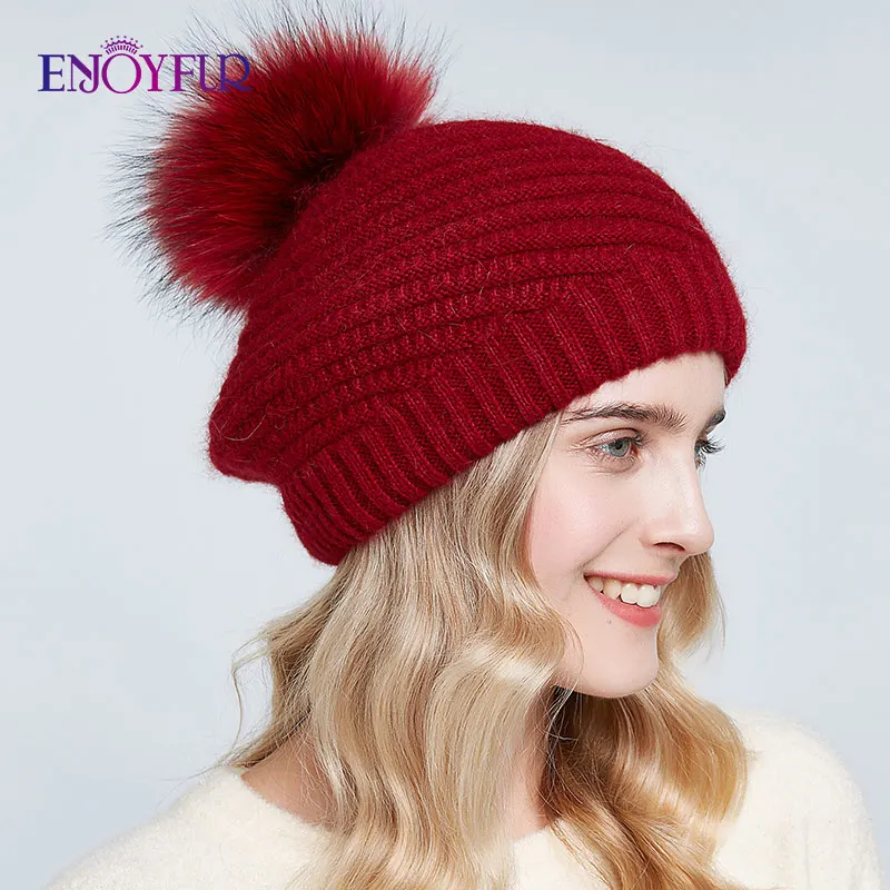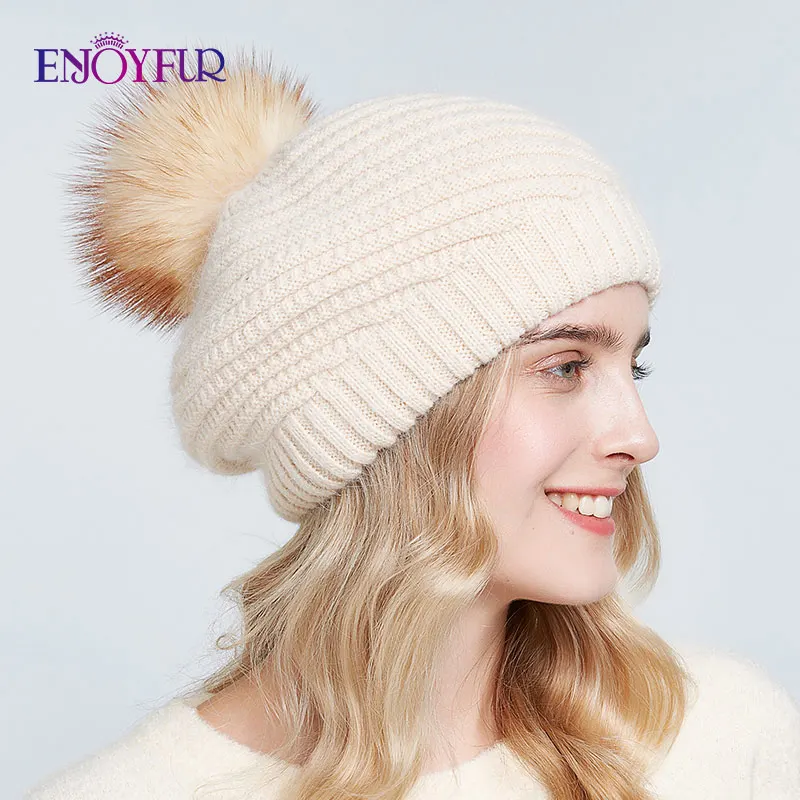Special Offer ENJOYFUR zimowe futra królika berety kapelusz dla kobiet prawdziwe pompon futrzany slouchy czapki pani ciepłe, jesienne czapki Discount 40% Today!