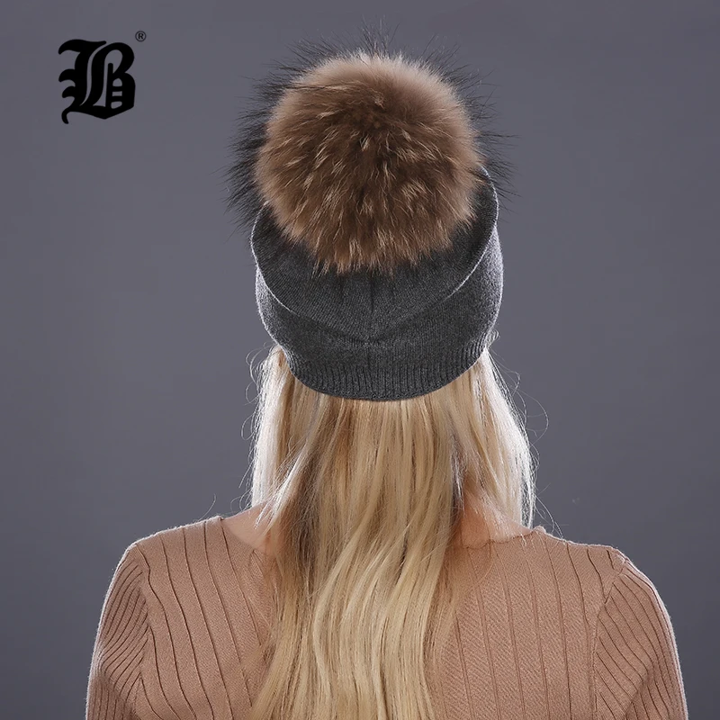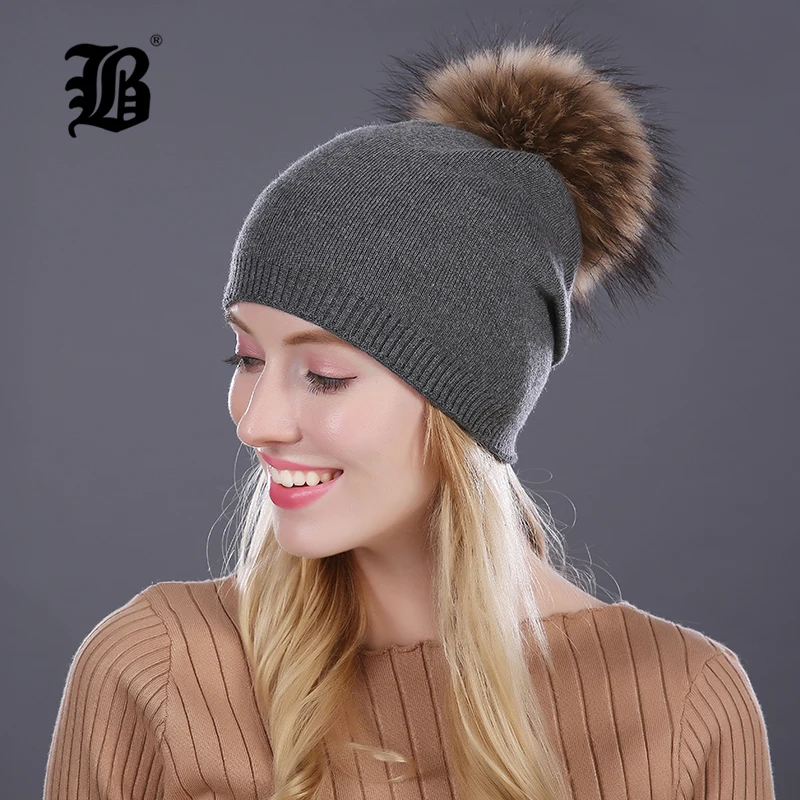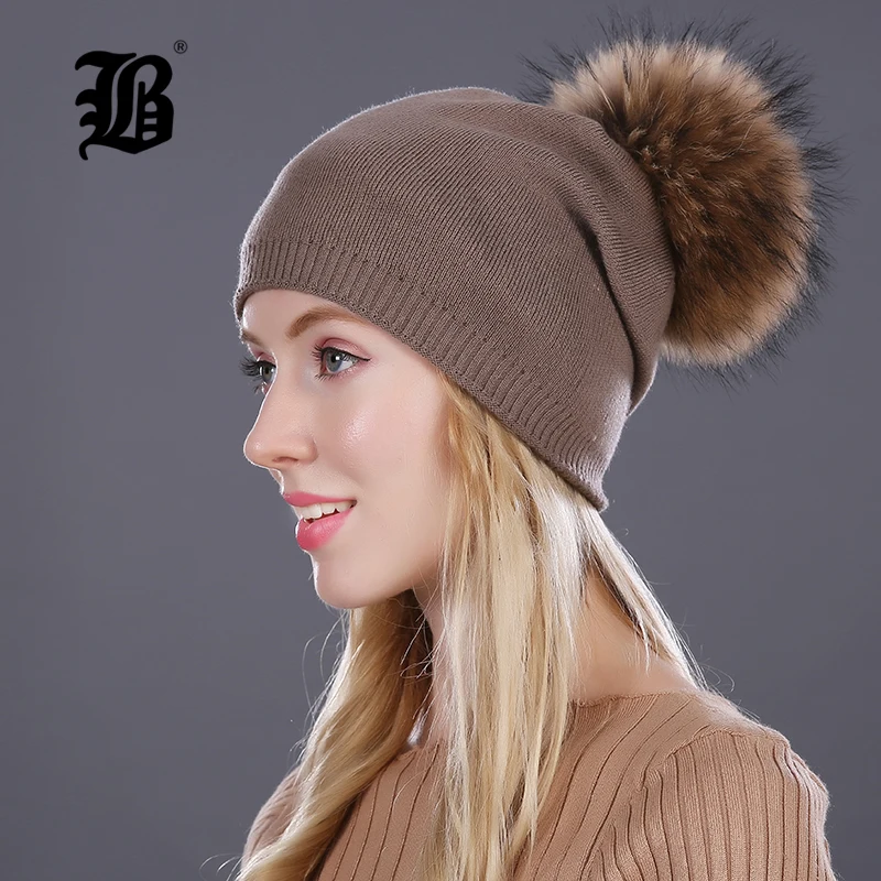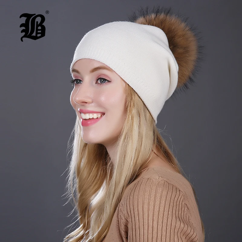 Special Offer [FLB] jesienno zimowa czapka dzianinowa wełniana czapka unisex Skullies nieformalna czapka prawdziwy szop pompon z futra lisa jednolite kolory czapka narciarska Discount 49% Today!