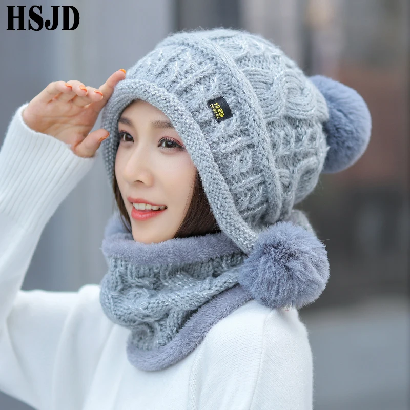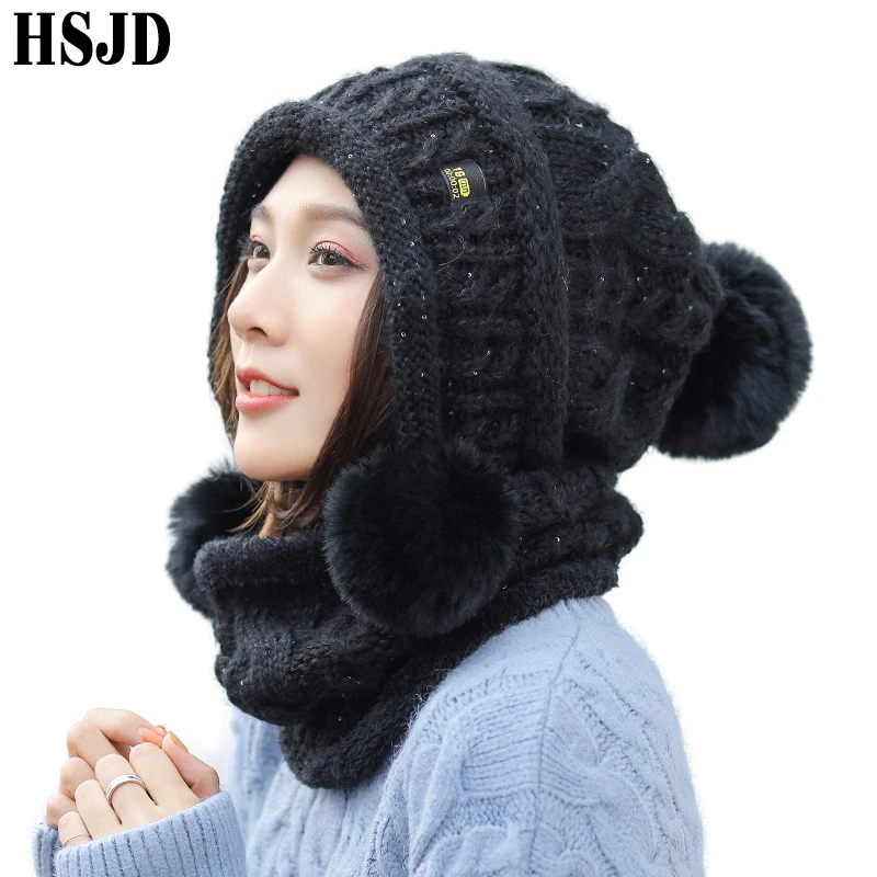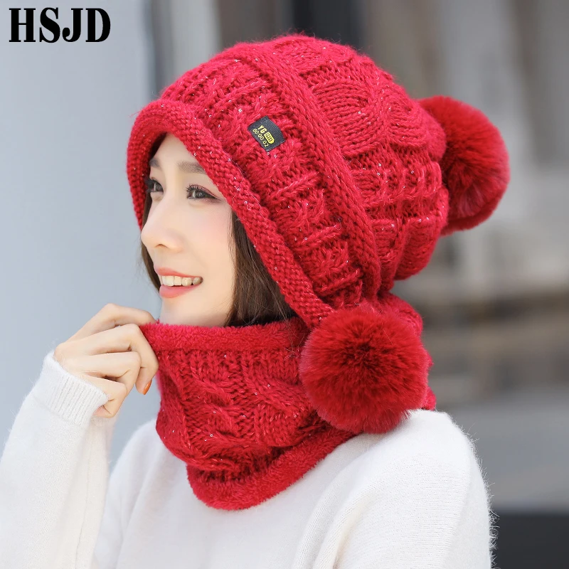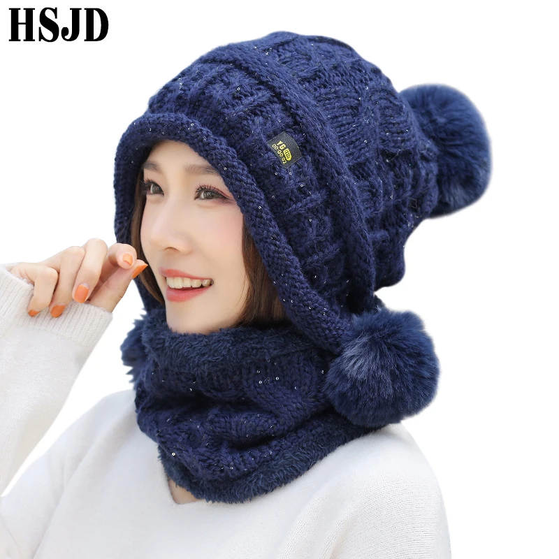 Special Offer Czapki zimowe dla kobiet cekiny szalik z dzianiny kapelusz śliczne trzy pompon ucha ciepłe Skullies czapki czapki szyi cieplej dzianiny 2 sztuk zestaw Discount 42% Today!