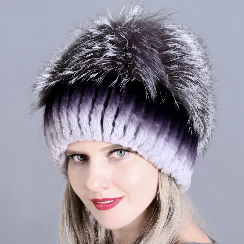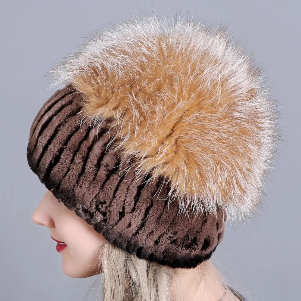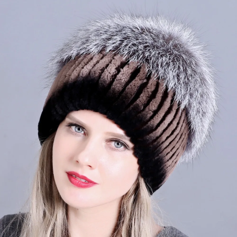 Product Name: Damska czapka zimowa czapka prawdziwe futro królika rex czapki dla kobiet Knitting Beanie zagęścić kobiece luksusowe czapka Fox czapka damska