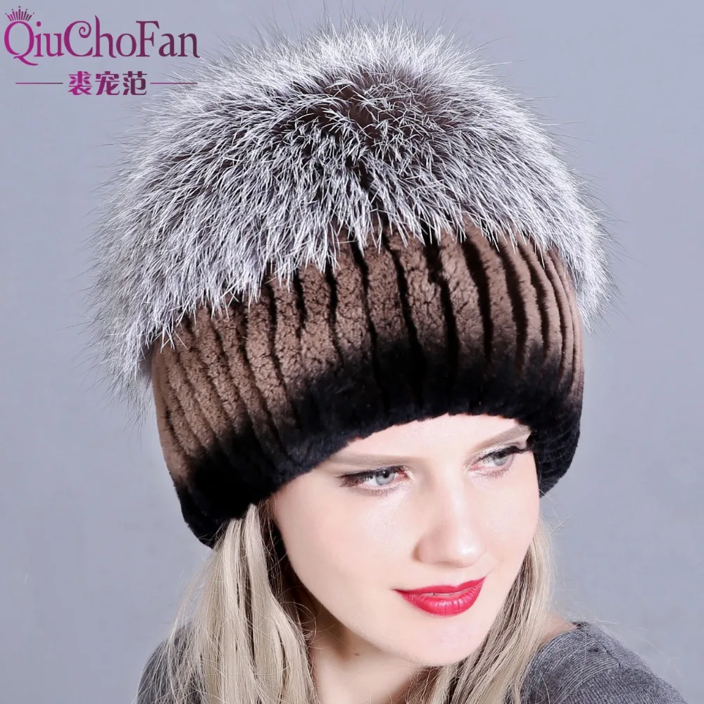 Special Offer Damska czapka zimowa czapka prawdziwe futro królika rex czapki dla kobiet Knitting Beanie zagęścić kobiece luksusowe czapka Fox czapka damska Discount 45% Today!