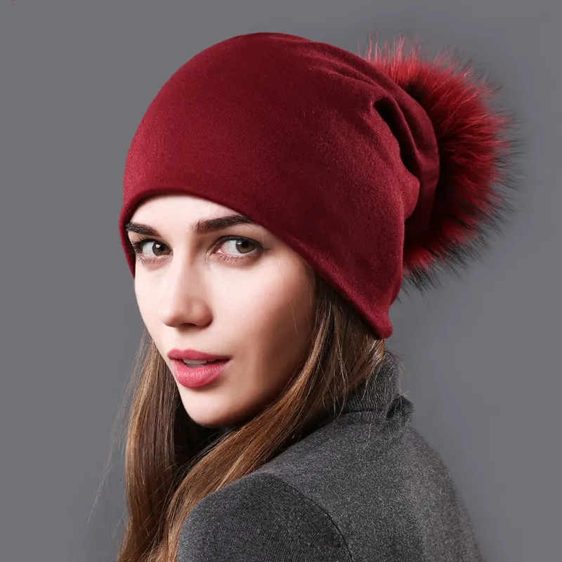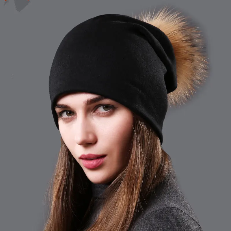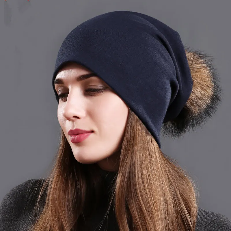 Product Name: NUZADA czapka zimowa kobiety prawdziwe futro Pom Pom kapelusz bawełna czapki z dzianiny podwójne tkaniny ciepłe czapka beanie moda damska czapki narciarskie