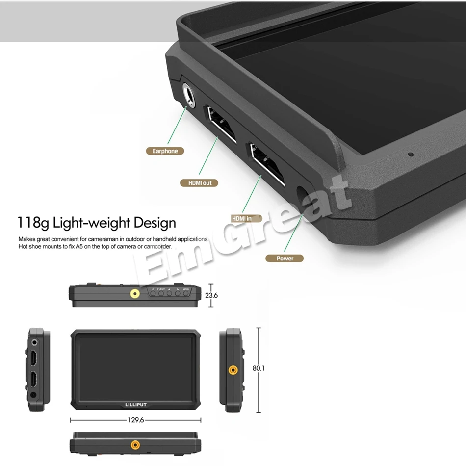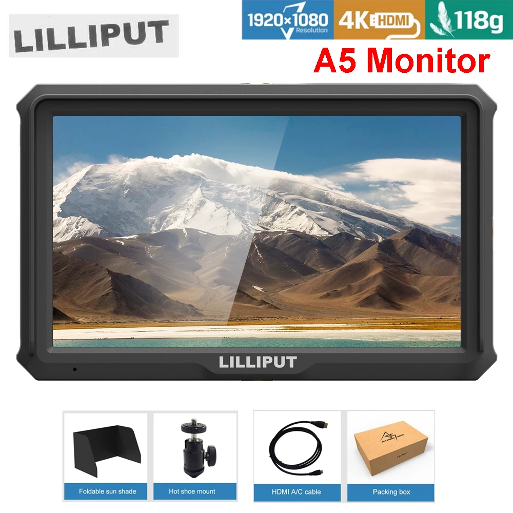Product Name: Lilliput A5 5 Cal tylko 118g full hd 1920x1080 4K HDMI na kamery Monitor zewnętrzny transmisji Monitor dla Canon Nikon Sony Zhiyun Gimbal