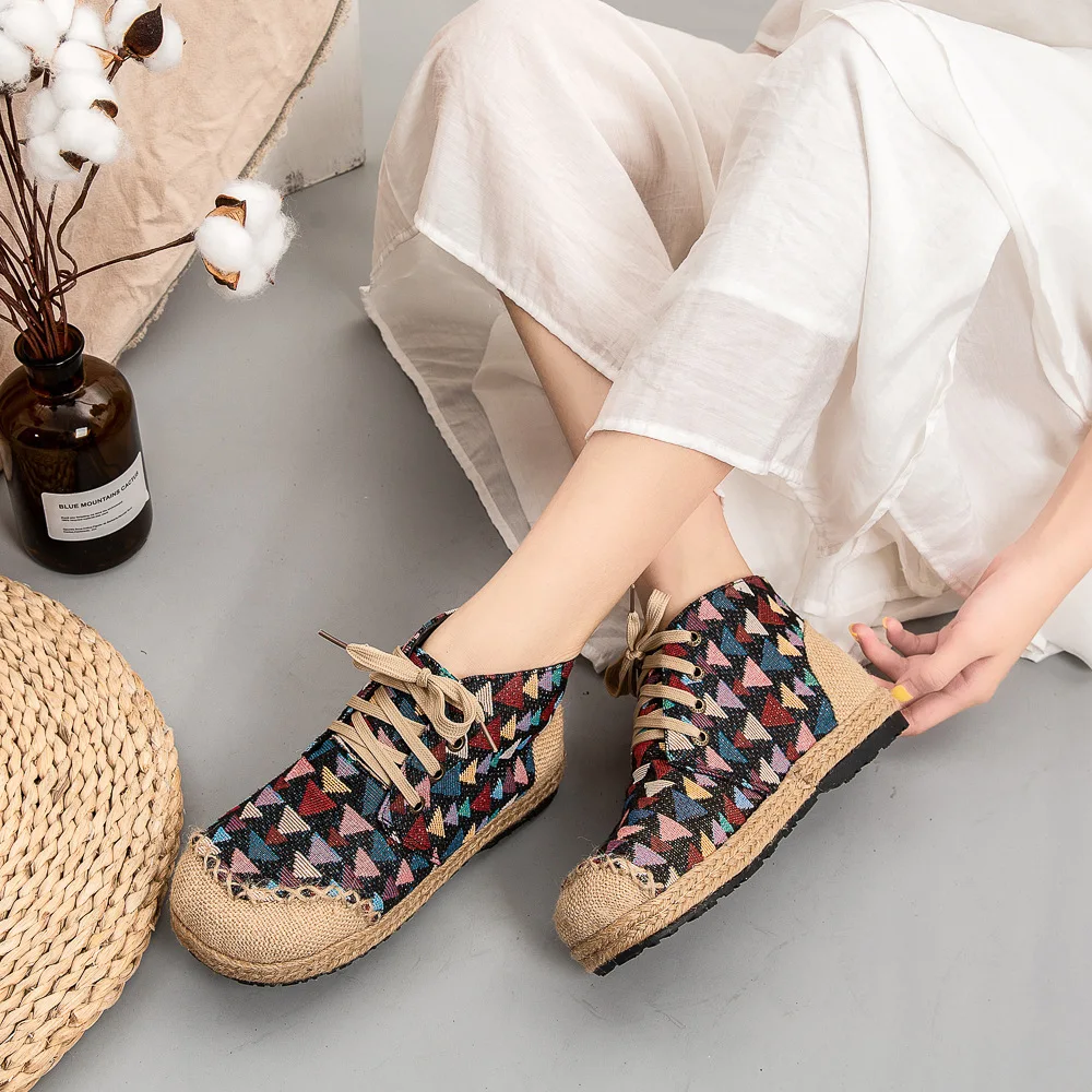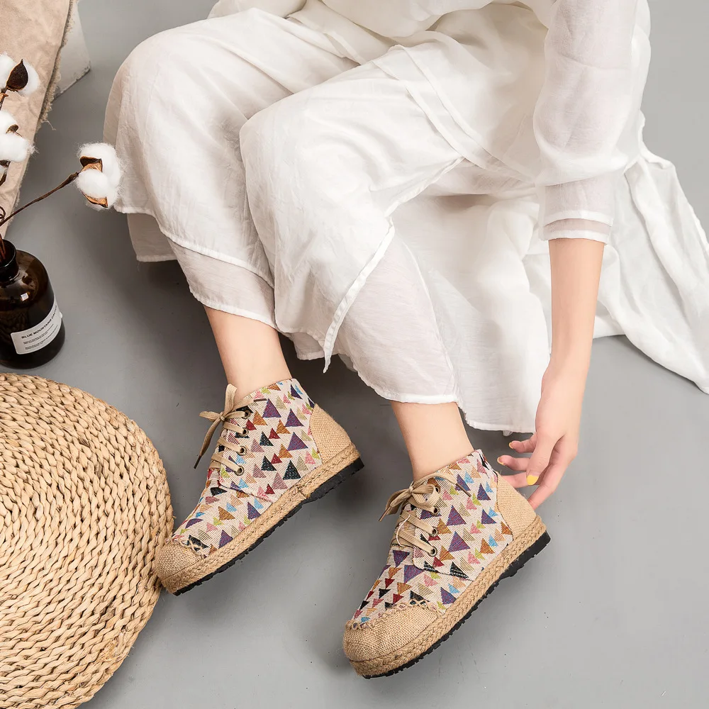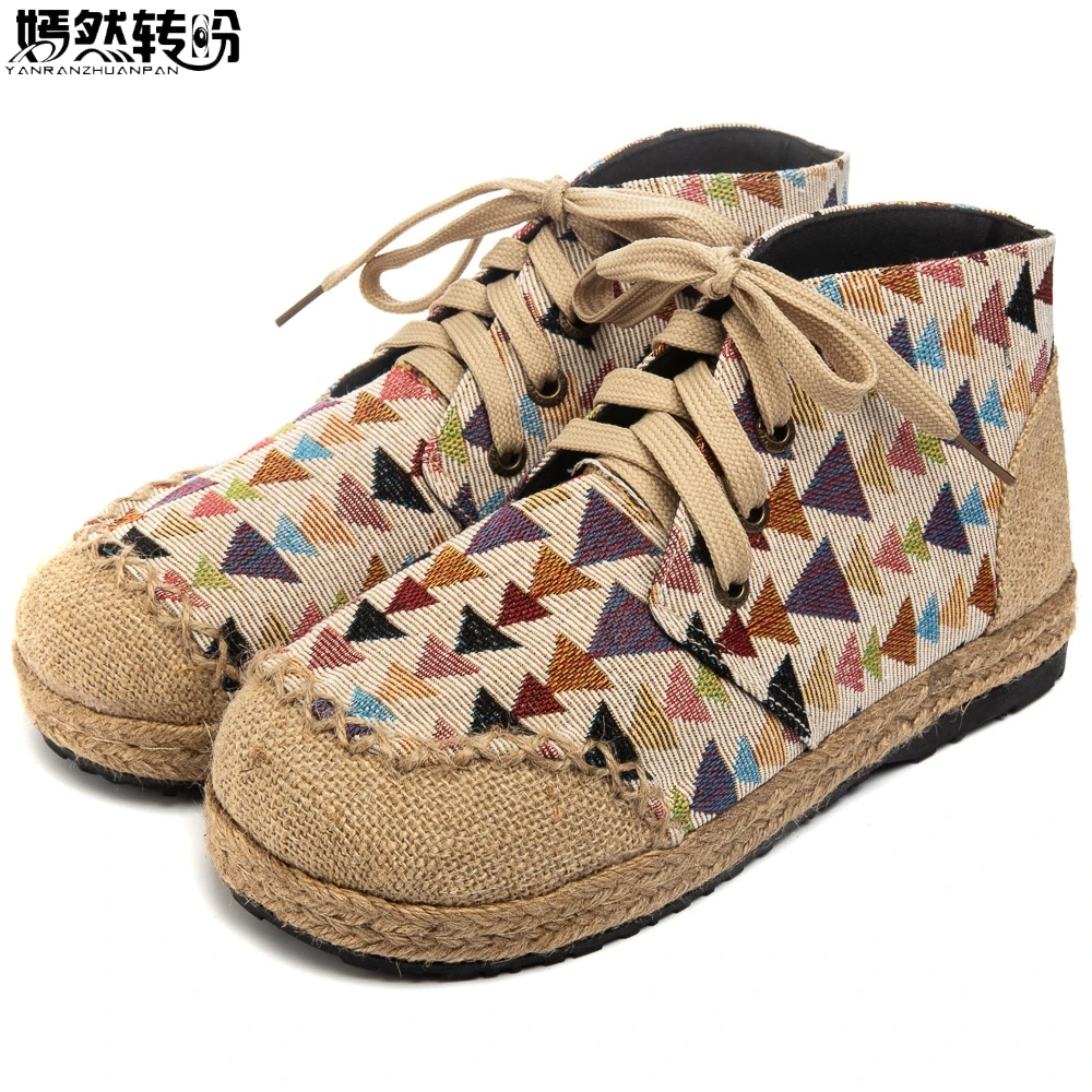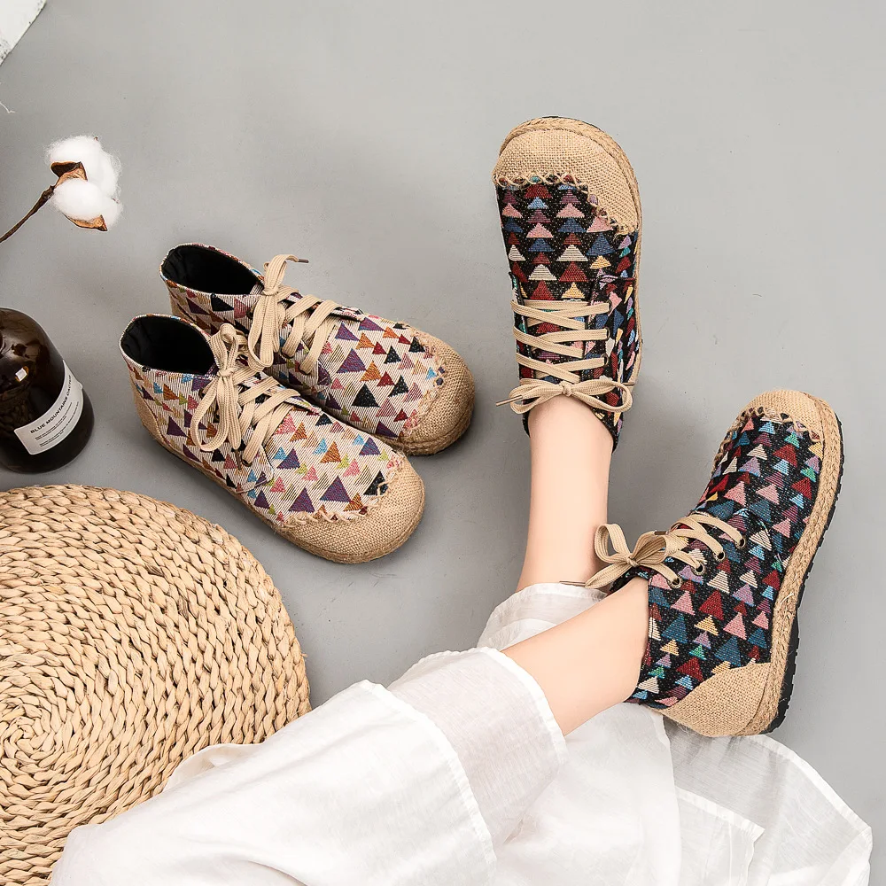 Product Name: Buty damskie w stylu Vintage, tajskie, Boho, bawełniane, płótno lniane, pojedynczy, narodowy, nadruk trójkąt, ręcznie tkane, okrągłe Toe, wiązane płaskie buty