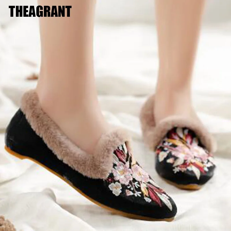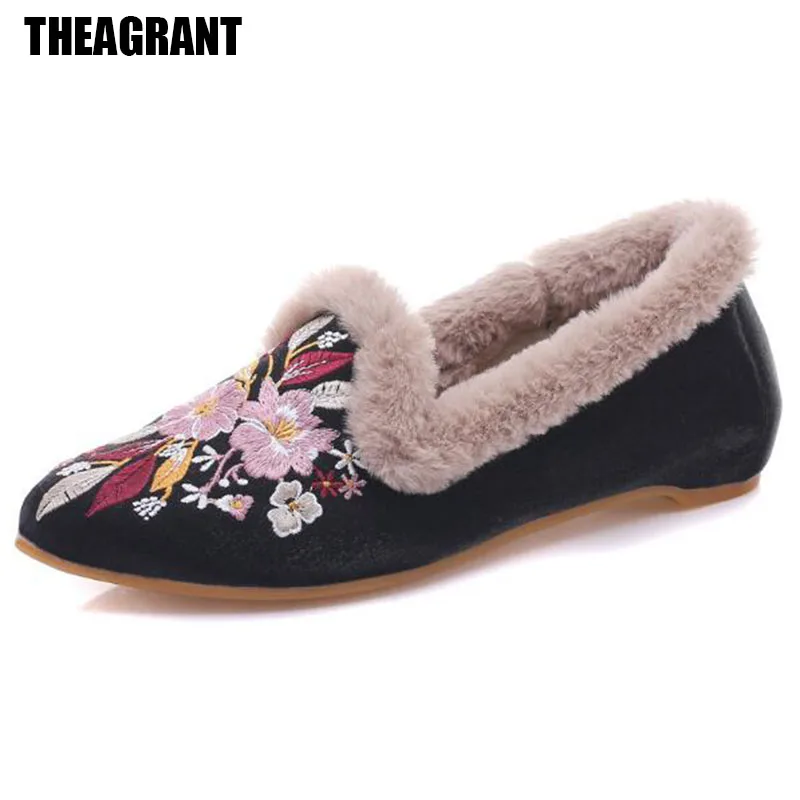 Special Offer THEAGRANT haftować buty zimowe kobieta ciepłe futro z polaru na co dzień kobiety mieszkania mokasyny etniczny Slip on panie chiński buty WFS2015 Discount 45% Today!