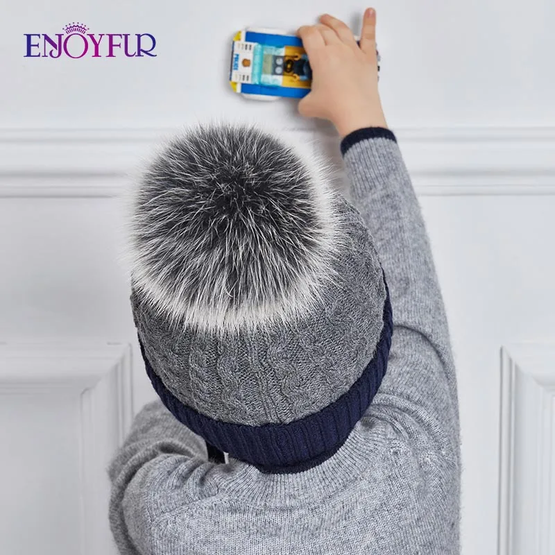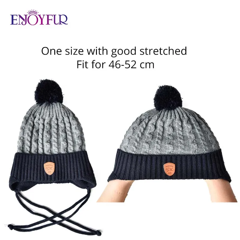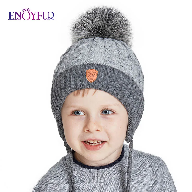 Special Offer ENJOYFUR czapeczki zimowe dla niemowląt prawdziwe futro z lisa czapka z pomponem dzianiny chłopięca czapka bawełniana chroń uszy kapelusz ciepłe grube czapki dla dzieci Discount 46% Today!