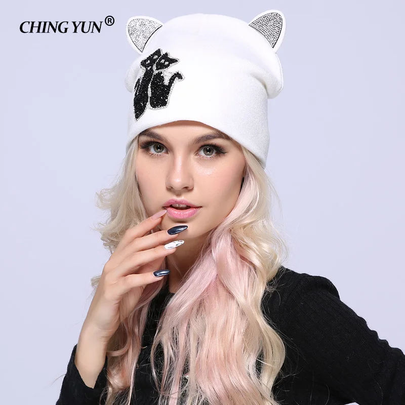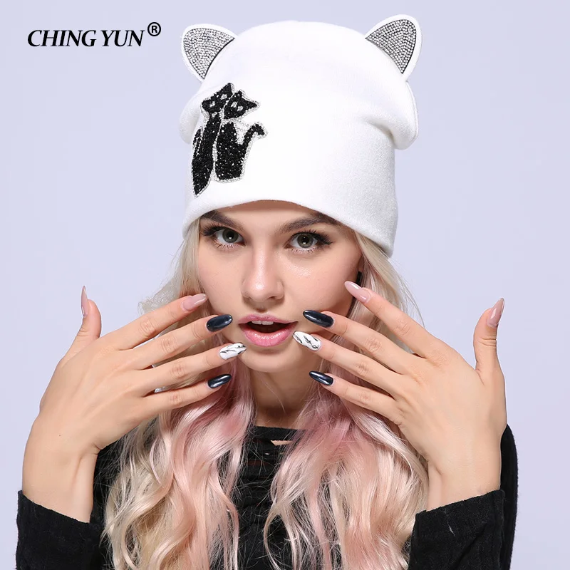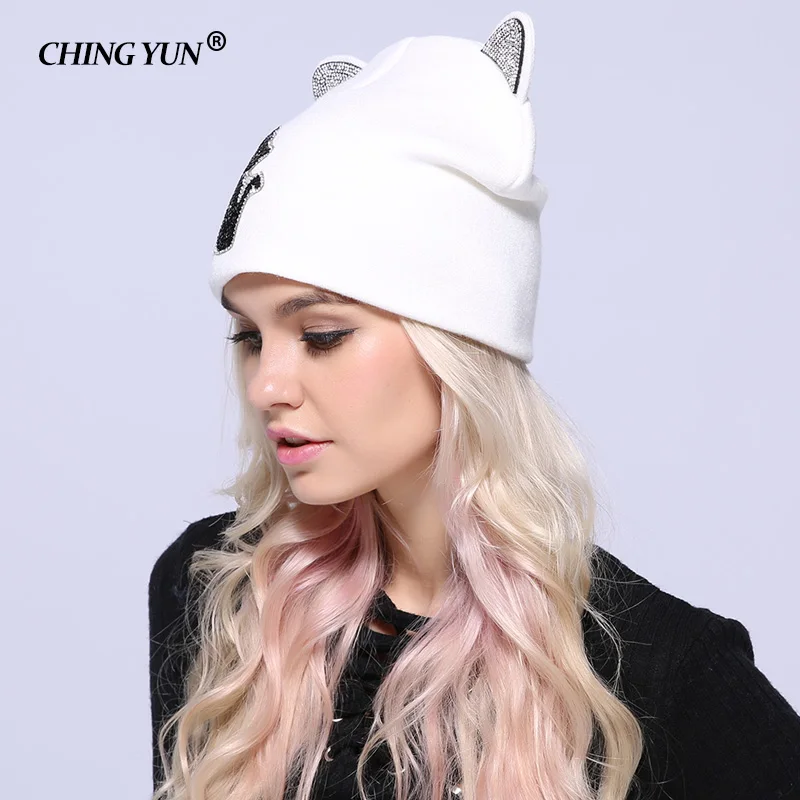 Special Offer Nowe zimowe damskie czapki z dzianiny lady ciepłe czapki diamentowe kotek uszy stałe grubsze dziewczyny czapka słodkie wysokiej jakości wełny kapelusz 2018 Discount 30% Today!