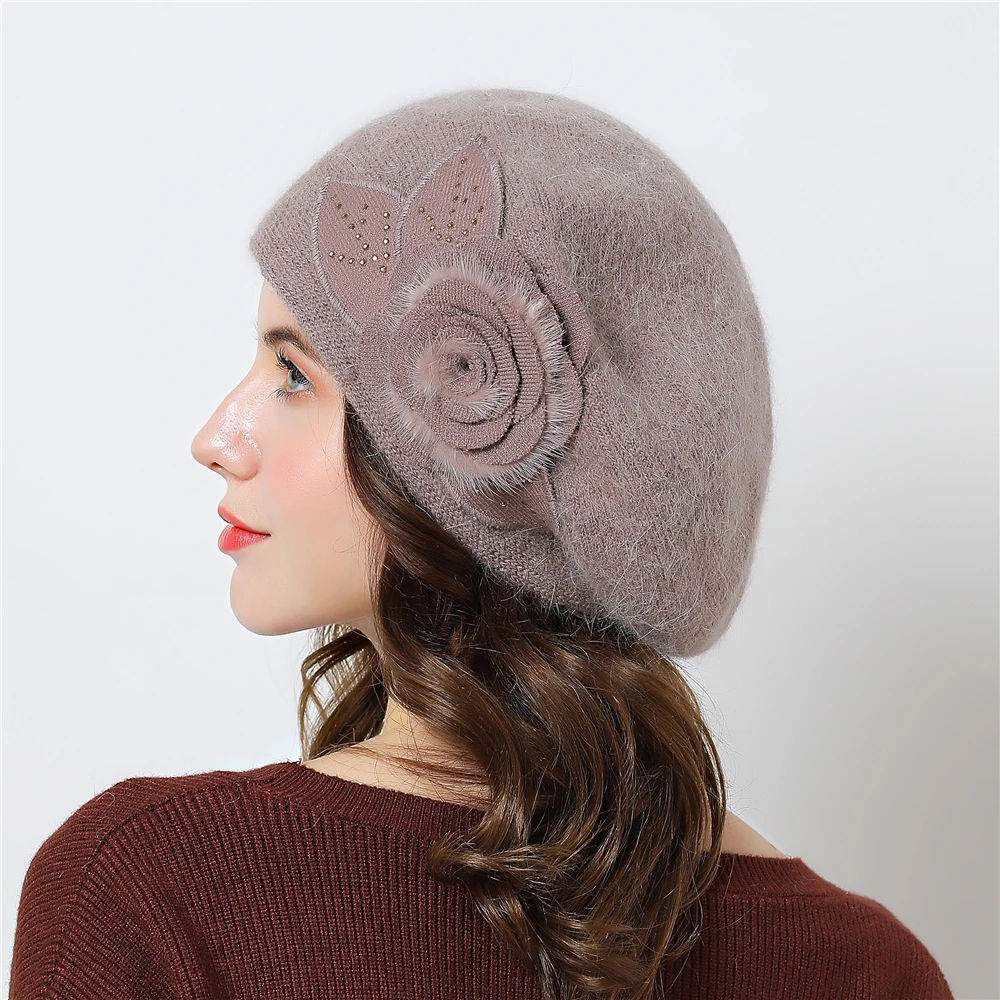 Special Offer Podwójna warstwowa konstrukcja czapki zimowe dla kobiet kapelusz futra królika dla kobiet czapka z dzianiny duże kwiatowe czapki czapki 2019 nowe czapki damskie Discount 42% Today!
