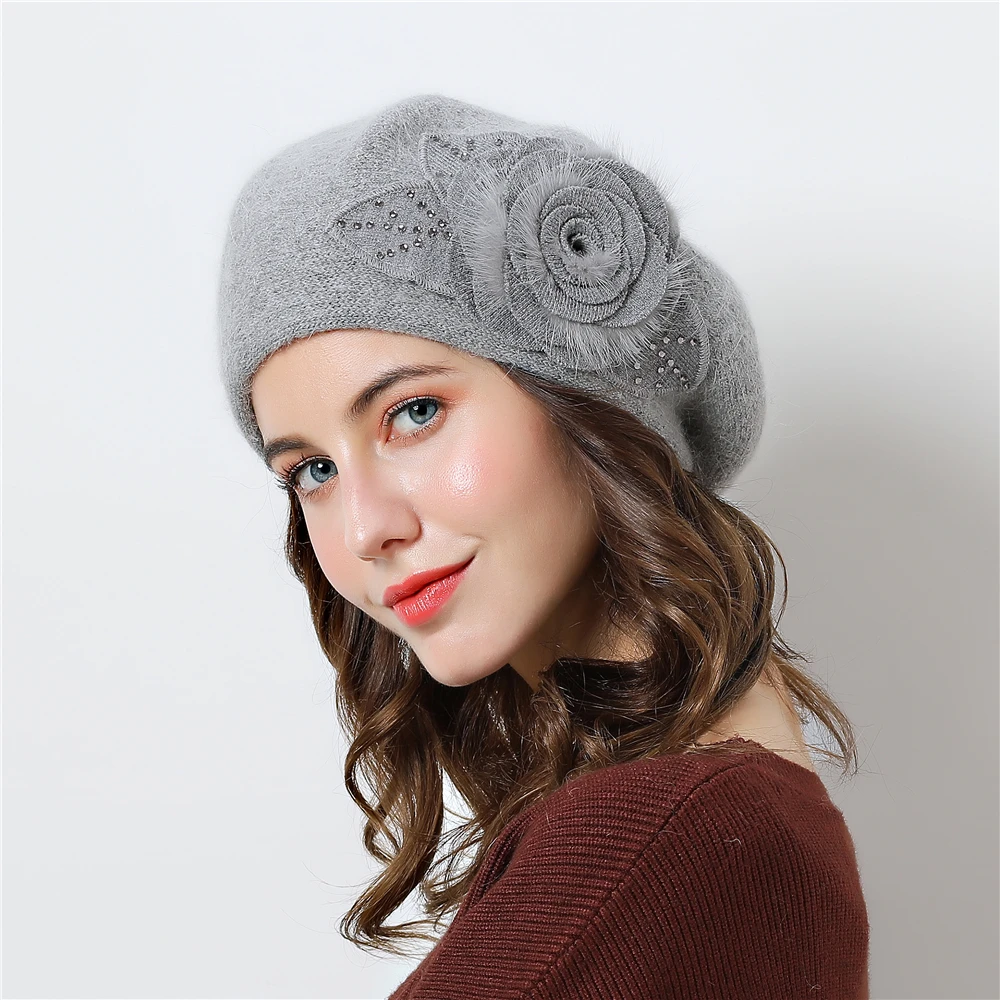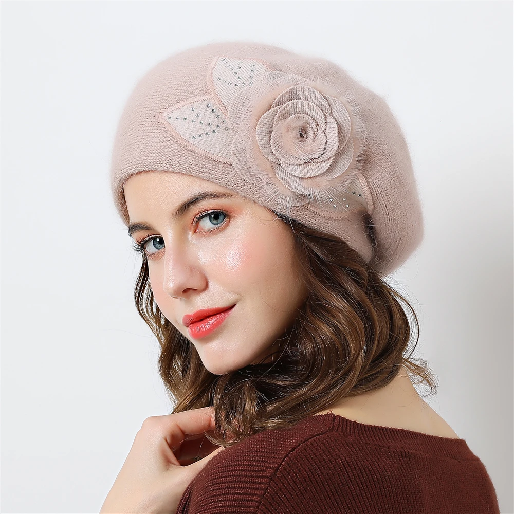 Product Name: Podwójna warstwowa konstrukcja czapki zimowe dla kobiet kapelusz futra królika dla kobiet czapka z dzianiny duże kwiatowe czapki czapki 2019 nowe czapki damskie