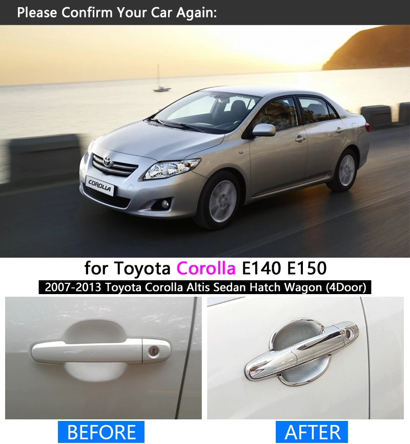 Product Name: Dla Toyota Corolla E140 E150 2007 2013 chromowana pokrywa klamki zestaw wykończeniowy 2008 2009 2010 2011 2012 akcesoria naklejki samochód stylizacji