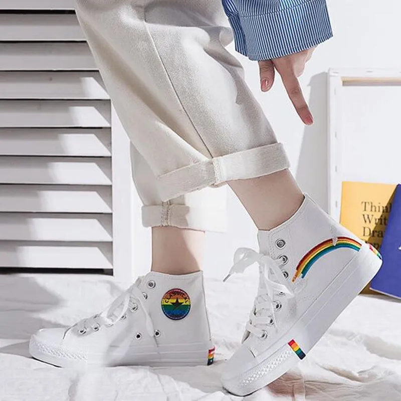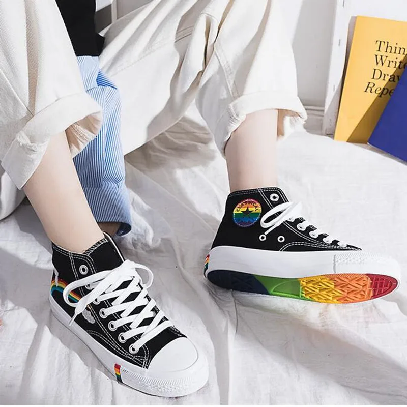 Special Offer Nowe mody czarne oddychające klasyczne wysokie damskie płócienne trampki tęczowe podeszwy wysokie buty wulkanizowane tenisówki damskie Casual Discount 30% Today!