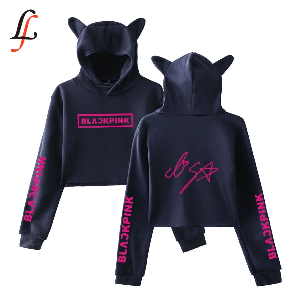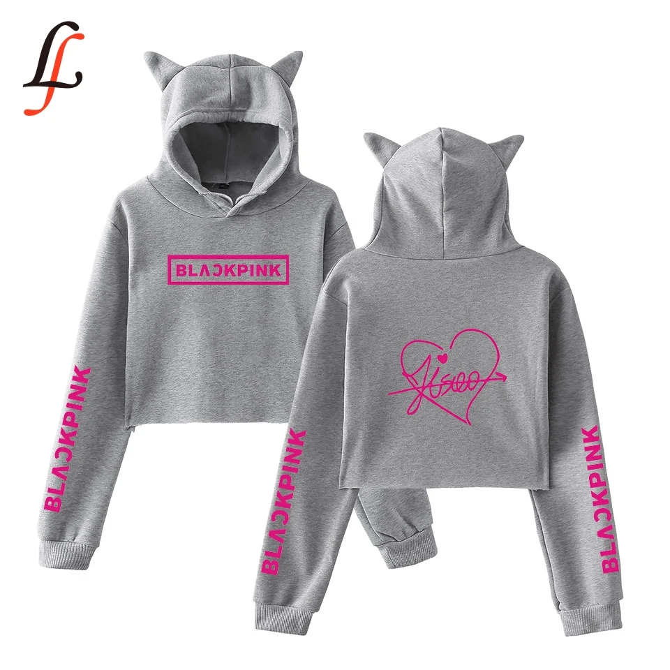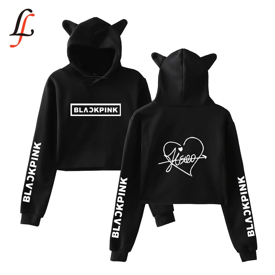 Product Name: Blackpink harajuku kot ucho Cap bluzy trend w modzie sala kot Crop Top bluzy z kapturem z długim rękawem dla kobiet Sexy hot Kpop ubrania