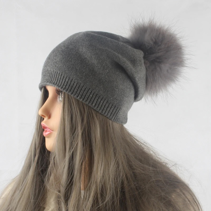 Special Offer Wełniana damska zimowa czapka z dzianiny czapka z pomponem naturalne futro z lisa pompony kapelusz jednokolorowa czapka przyczynowa Discount 40% Today!