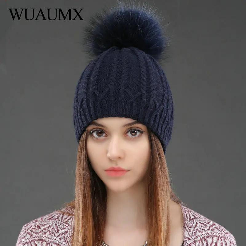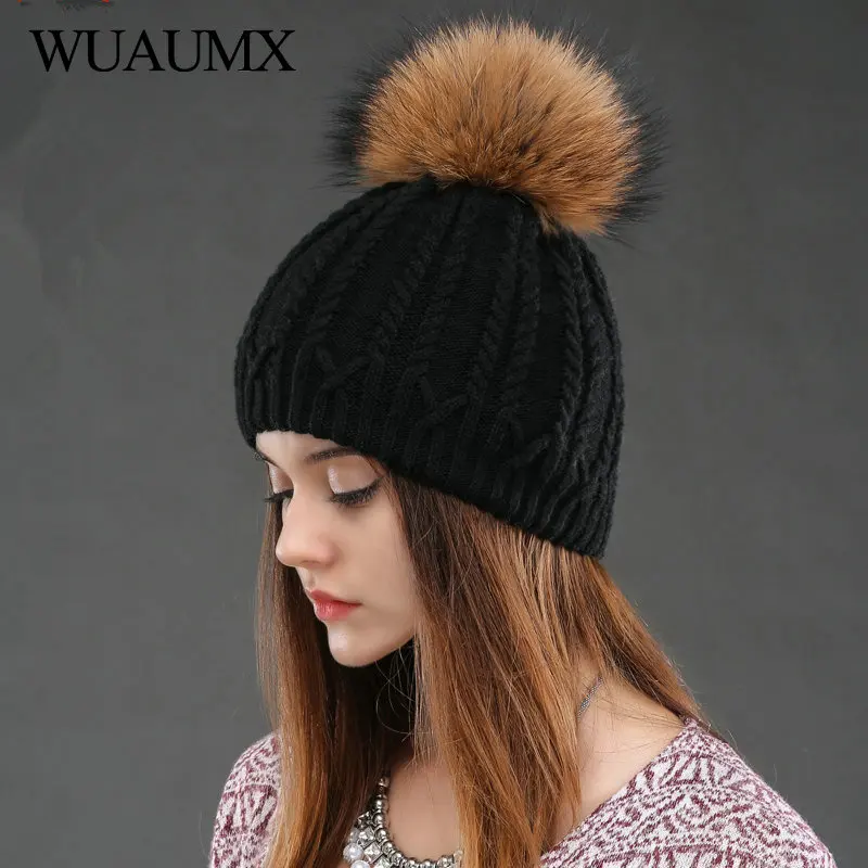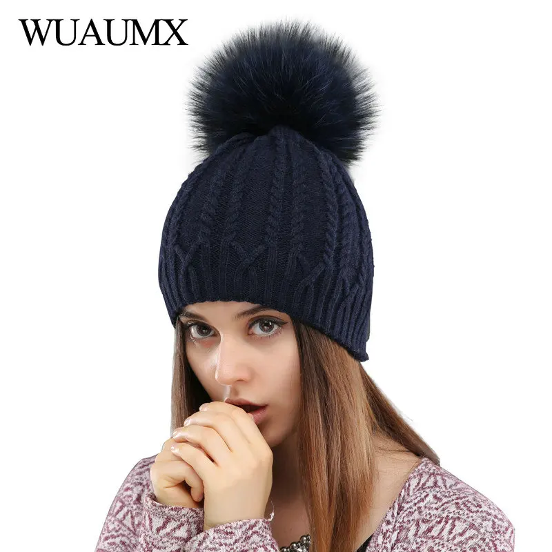Product Name: Wuaumx nowa dwuwarstwowa dzianinowa wełniana czapka naturalna szop futrzana czapka na zimę dla kobiet kobieta czapki z pomponem Skullies czapki czapka